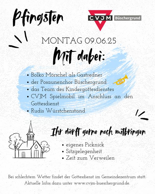 Bei schlechtem Wetter findet der Gottesdienst im Gemeindezentrum Büschergrund statt. Diese Info findet ihr dann zeitnah hier auf der Homepage.